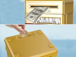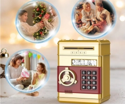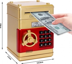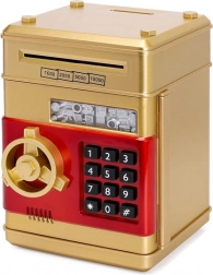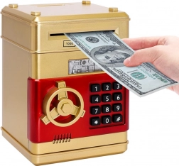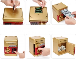 Je vyrobena z odolného plastového materiálu ve zlaté barvě. Tato pokladnička umožňuje snadné vkládání mincí a bankovek, a navíc je zde možnost nastavení pin kódu až se 4 číslicemi.
