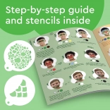 - Kompletní balení: 8 barev včetně metalické zelené, štětec, houbička, šablony, obrázkový návod.