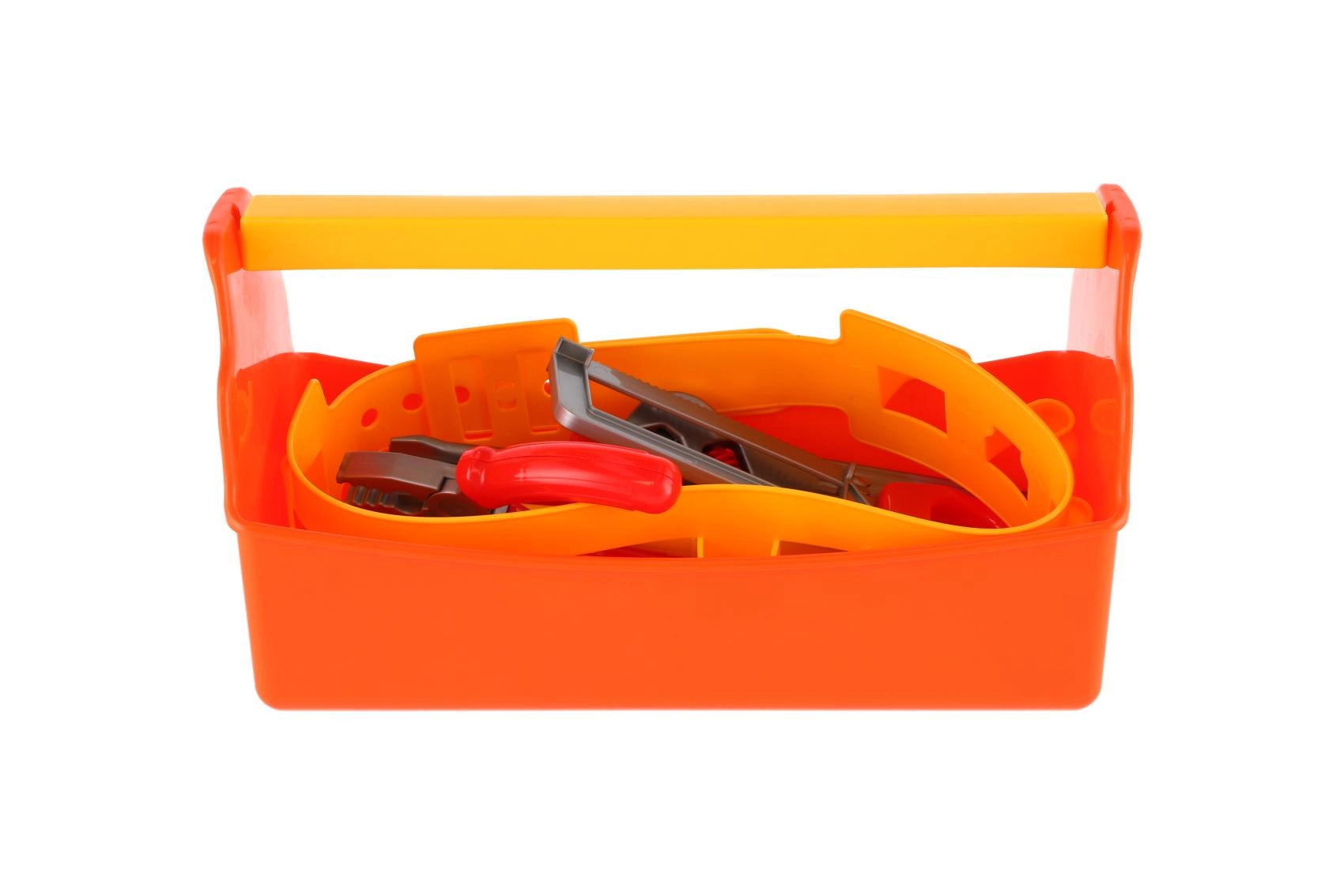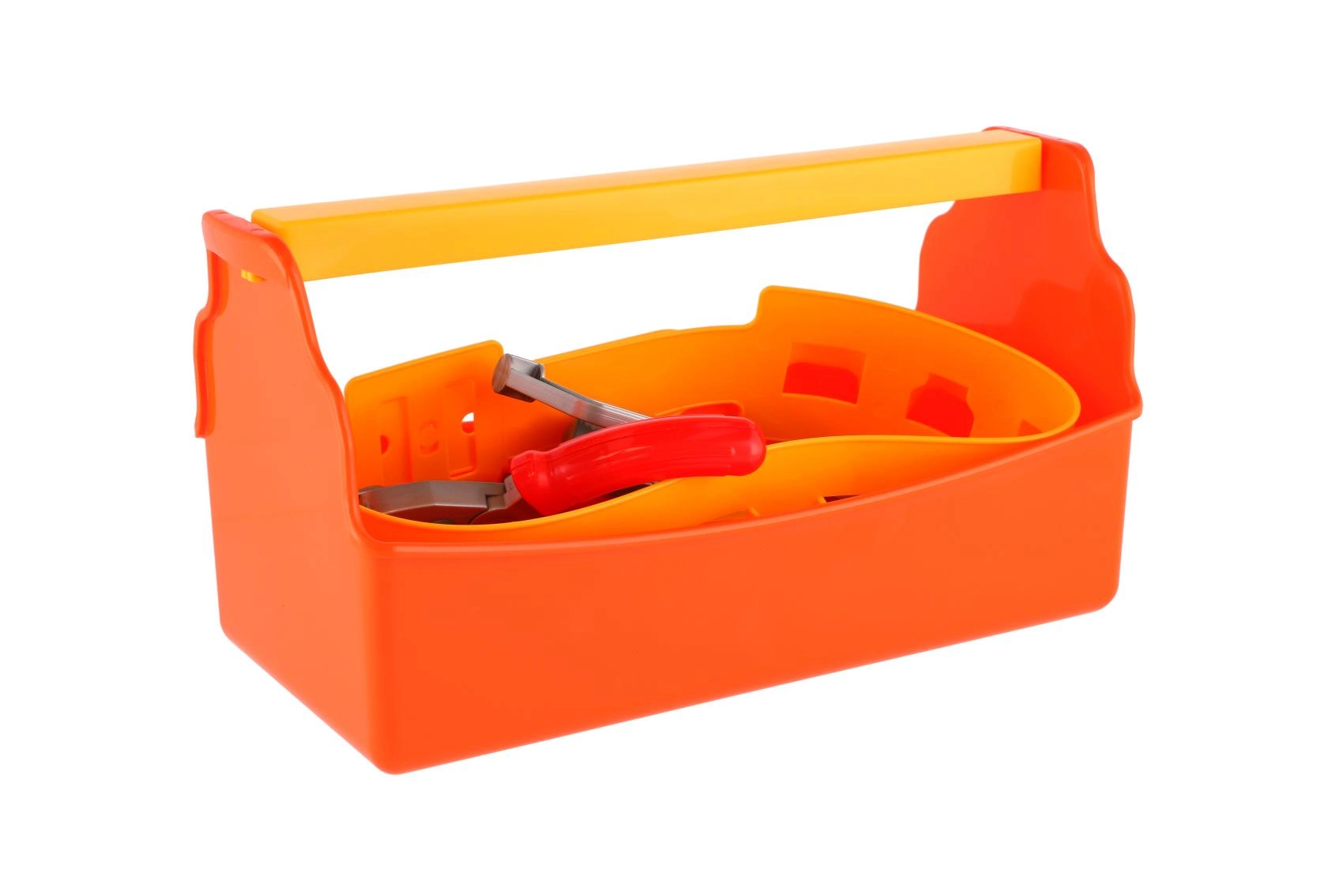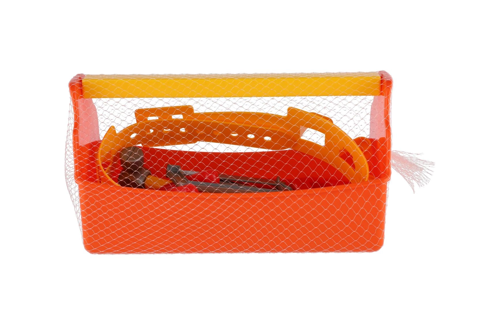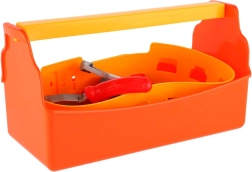 Oranžová plastová bedýnka s pevným žlutým uchem a vnitřní přihrádkou udrží všechny nástroje přehledně na jednom místě a děti ji snadno přenesou.