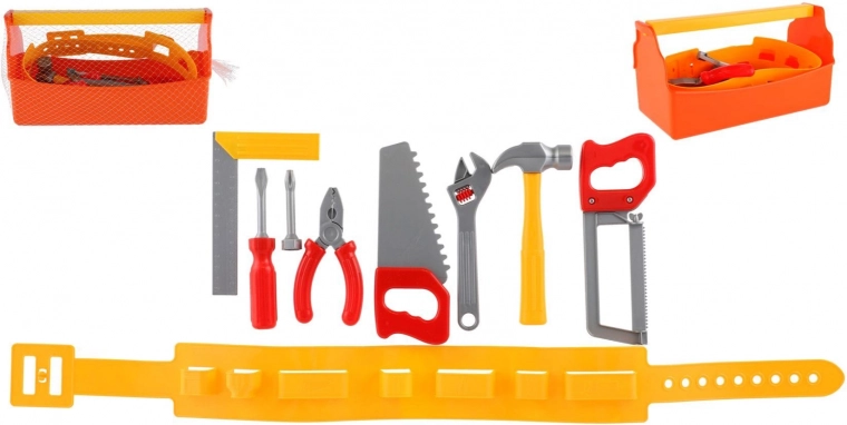 - Plastová bedýnka, opasek na nářadí, výběr dětských nástrojů (např. kladívko, klíč, kleště, šroubovák, pilka)
