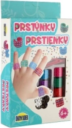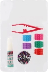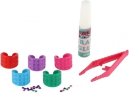Praktická sada obsahuje prstýnky, lepidlo, pinzetu i barevné kamínky – děti mohou začít tvořit hned po otevření.