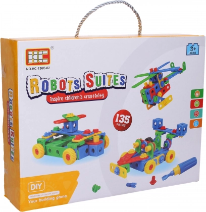 Stavebnice šroubovací. Obsahuje 135 dílků, šroubovák, a obrázky výrobků pro inspiraci.