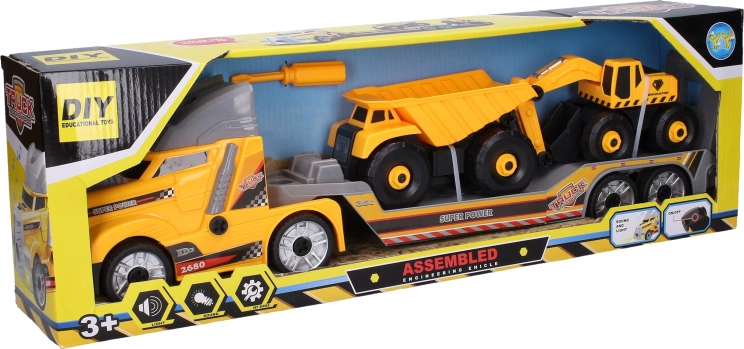 Šroubovací auto tahač 62 cm se světly a zvuky, se sklápěčem a bagrem. Volná kola, ON/OFF přepínač, šroubovák s klíčem. Skvělá hračka pro malé stavitele.