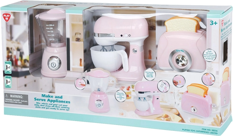 Sada 3 dětských spotřebičů Playgo přináší realistickou zábavu do každé dětské kuchyňky. V moderním růžovém provedení mohou děti bezpečně napodobovat dospělé a trénovat jemnou motoriku, kreativitu i sociální dovednosti. Každý přístroj je navržen tak, aby vypadal a choval se jako skutečný, včetně světelných a zvukových efektů.