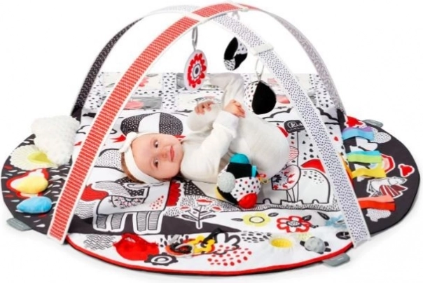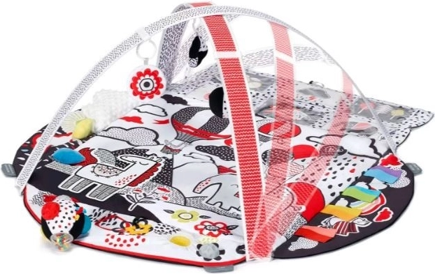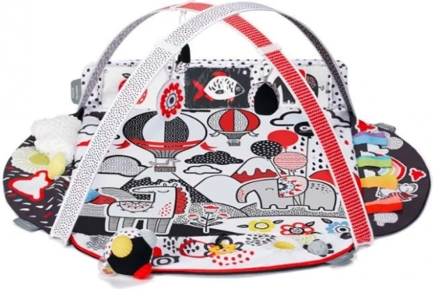 Objevte chytrou hrací deku KINDERKRAFT 4Smart Premium se 4 senzorickými zónami pro rozvoj zraku, sluchu, hmatu a soustředění. Kontrastní barvy černá/bílá/červená se žlutými akcenty přitahují pozornost miminka už od prvních dní. Součástí jsou 2 nastavitelné hrazdy s pohyblivými závěsnými hračkami, včetně 12 kontrastních karet, zrcátka, chrastítek i senzorického míčku. Měkká, snadno udržovatelná a bezpečná deka splňuje normy pro dětské hračky.