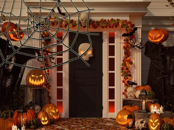 Velká černá pavučina ihned promění verandu či vstupní dveře v strašidelnou scénu. Ideální pro vítání koledníků a dekorování domova.