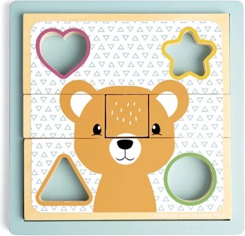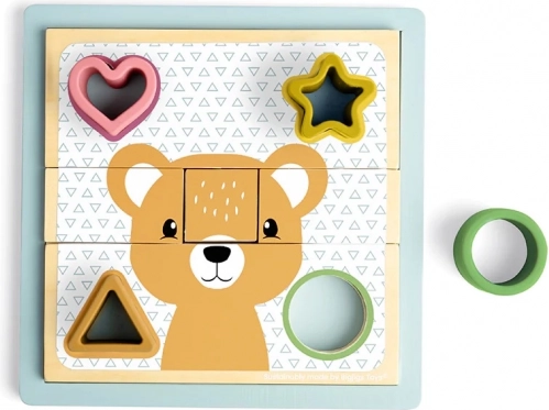 Toto všestranné dřevěné puzzle je na první pohled třídicí hra, ale při bližším zkoumání odhalí svou druhou tvář – skládačku s překvapivými obrázky. Otočte jednotlivé dílky, skládejte je do správných výřezů a poskládejte roztomilého medvídka nebo lišku. Díky kombinaci dřeva a příjemného silikonu se s dílky snadno manipuluje a vydrží i náročnější dětské zacházení.