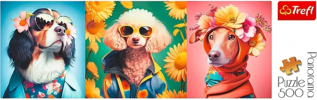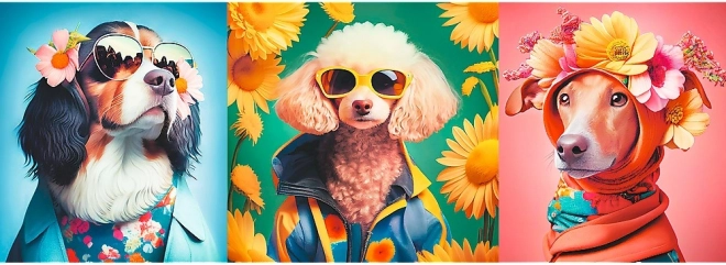 Objevte hravý svět psí módní přehlídky v pestrých barvách a působivém panoramatickém formátu. Stylově oblečení pejsci se slunečními brýlemi a květinami promění skládání v zábavný zážitek a hotový obraz se stane originální dekorací.