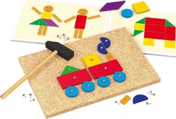Zábavná a edukativní hra pro malé kutily, která rozvíjí jemnou motoriku, kreativitu a koordinaci oko–ruka. Pomocí kladívka, hřebíčků a 50 dřevěných dílků různého tvaru a barvy děti tvoří na stabilní korkové desce barevné obrázky podle předloh i vlastní fantazie.