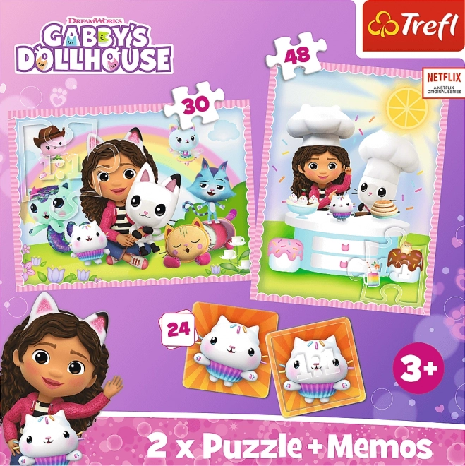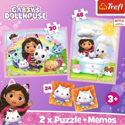 Tento set kombinuje dvě samostatné skládačky (30 a 48 dílků) a 24 karet pexesa s oblíbenými hrdiny ze seriálu Kocí domek Gabi. Dílky jsou z odolného, silného kartonu, snadno se drží a jsou bezpečné pro malé ruce. Živá, mnohobarevná grafika děti motivuje k delší hře a přirozeně rozvíjí jejich dovednosti.