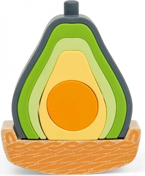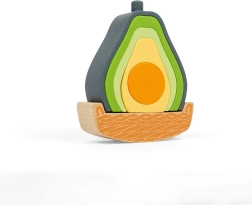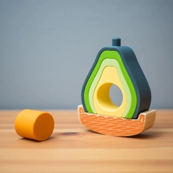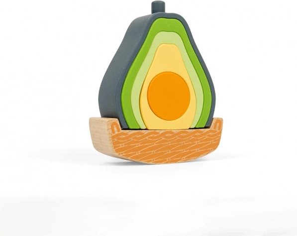 Hrací set ve tvaru avokáda spojuje dřevo s potravinářským silikonem pro bezpečné a zábavné učení. Děti mohou dílky stohovat, třídit a nechat avokádo houpat v dřevěné základně. Pět silikonových částí je měkkých, odolných a skvěle slouží jako smyslová hračka. Materiály jsou netoxické, silikon lze mýt v myčce a dřevěné části nesou certifikaci FSC.