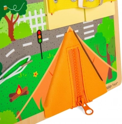 Různorodé mechaniky – od zipu po západky – učí děti praktickým dovednostem a posilují jemnou motoriku v přirozené, hravé formě.