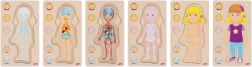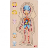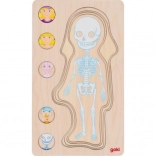 Toto puzzle ukazuje lidské tělo ve pěti vrstvách, každá vrstva detailně zobrazuje různé systémy v těle od kostí, přes svaly až po vnitřní orgány.