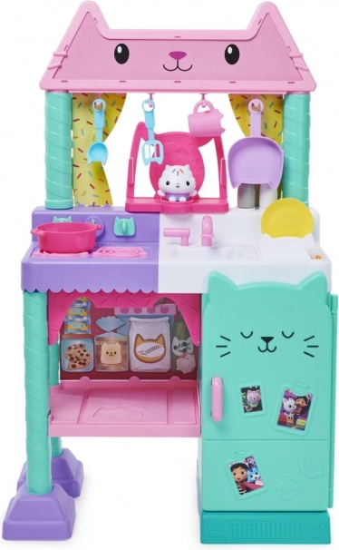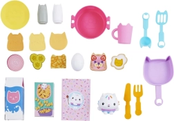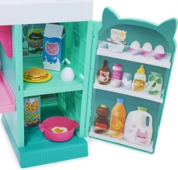 Design ladí se světem GABBY'S DOLLHOUSE – v pastelových tónech tyrkysové, růžové a fialové. Kuchyňka má otočná knoflíky, otevíratelnou lednici a háčky na zavěšení náčiní. V balení najdete pestrou sadu doplňků pro hraní na kuchaře, od hrnce a pánve po toastový chléb, vajíčko, sýr, zeleninu a další dobroty.