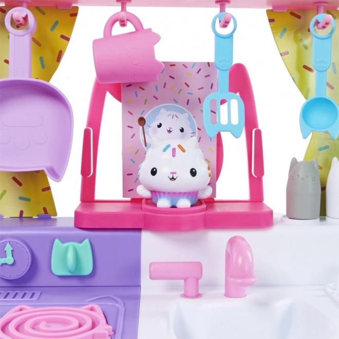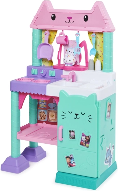 Velká dětská kuchyňka inspirovaná seriálem GABBY'S DOLLHOUSE potěší malé kuchaře pestrými barvami, roztomilým kočičím designem a 23 doplňky. Nabízí světelné a zvukové efekty (bublání, syčení, melodie), pohyblivé prvky a realistickou hru u sporáku, dřezu a lednice o výšce 90 cm.