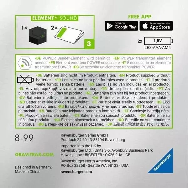 Rozšiřte svou kuličkovou dráhu GRAVITRAX o modul Power Sound a přidejte jí působivé zvukové efekty. Po přijetí signálu se spustí akční zvuk a můžete si přepínat mezi světy zvuků – od džungle až po vesmír. Jedním tlačítkem nastavíte i atmosférickou hudbu na pozadí. Modul rozvíjí kreativitu, podporuje zájem o fyziku, prostorovou geometrii a gravitaci a je skvělý pro děti i dospělé.