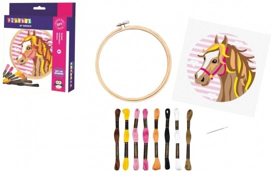 Vyšívání křížkovým stehem kůň vyšívací rámeček 1 předloha 8 bavlnek v krabičce 18x21x4cm