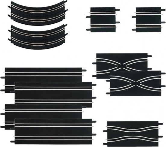 - 4× rovinka 342 mm, 2× křižovatka, 1× šikana, 2× díly na kolmou stěnu, 2× rovinka 114 mm