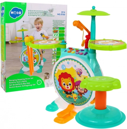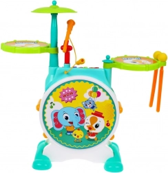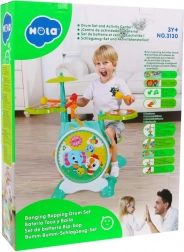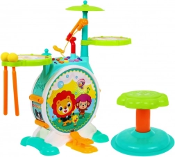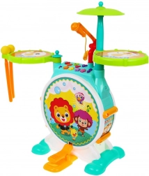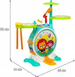 | | Interaktivní hudební hračka se zvukovými a světelnými efekty pro děti od tří let. Údery do basového bubnu a dvou bubínků (levého a pravého) a činelu pomocí paliček s gumovými hroty uslyšíte zvuky fantastických, skutečných nástrojů. Další zábavu lze umocnit připravenými hudebními a rytmickými skladbami na ovládacím panelu. Pod každou z not uspořádaných na desce (1 - 5) se skrývají živé a veselé hudební motivy (5 různých melodií). Modrá hvězda s bubny - skrývá zvuky bubnů. Žlutá hvězda s notami - skrývá další zvukové efekty. Zelená hvězdička s notami skrývá 10 hudebních skladeb, postupným stisknutím hvězdičky můžete spustit následující hudební motivy, Červená hvězdička s nástroji skrývá 4 rytmické motivy, postupným stisknutím hvězdičky můžete spustit následující 4 různé rytmické motivy. Další atrakcí pro batolata jsou blikající hvězdičky během hry. Na ovládacím panelu se navíc nacházejí dvě tlačítka zodpovědná za ztišení a zesílení hudby - mimořádně užitečné. Bubny mají také funkční mikrofon a speciální - praktický - držák na tyčinky. Funkce hračky: - zvuk, - světlo, - poznávací - vzdělávací. | Obsah sady | - 3-bubny s nožičkou, - činel, - mikrofon, - ovládací panel, - dvě paličky s gumovými hroty, - stolička. |