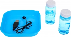 - Bublinková pistole, 2× náplň do bublin, akumulátor 3,7 V, nálepky, popruh, USB kabel, miska na tekutinu