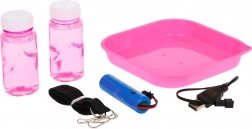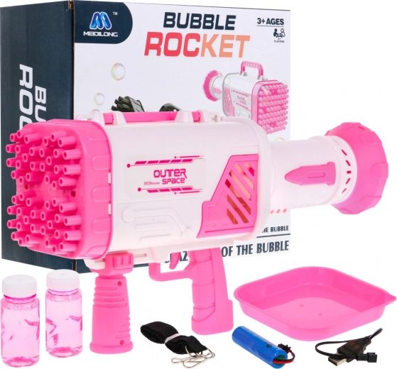 - Bublinkový pistolek, 2× roztok, akumulátor 3,7 V, samolepky, šňůrka, USB nabíjecí kabel, miska na roztok
