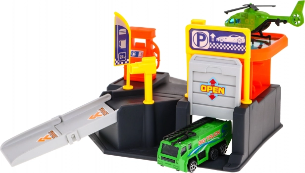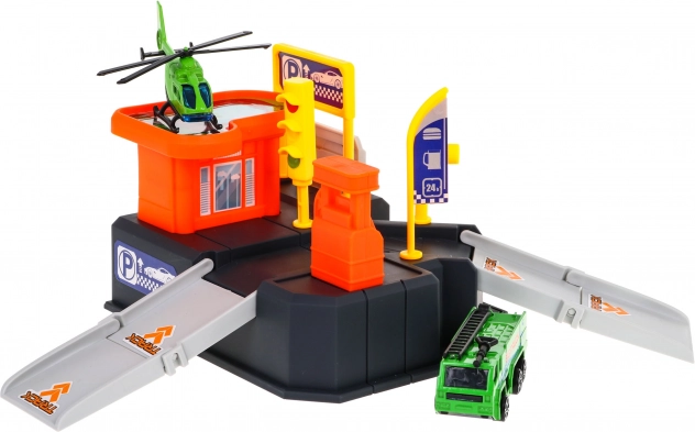 Tato barevná plastová sada promění pokoj v malé dopravní centrum. Dvouúrovňové parkoviště s rampami a helipadem doplňuje přehledná podložka s městem a silnicemi, po které mohou děti jezdit autíčkem a přistávat helikoptérou. Díky kompaktním rozměrům se snadno vejde do dětského pokoje a rychle se uklízí.