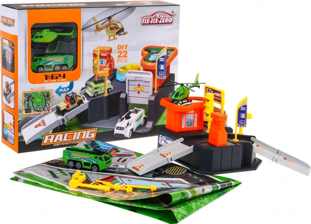 Součástí je autíčko, helikoptéra, značení a samolepky. Sada o 22 dílech je připravena k akci hned po vybalení.