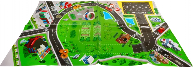 Podložka o rozměrech cca 78 × 58 cm zobrazuje ulice, parkoviště a budovy – ideální pro učení základů dopravních situací.