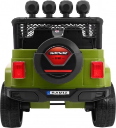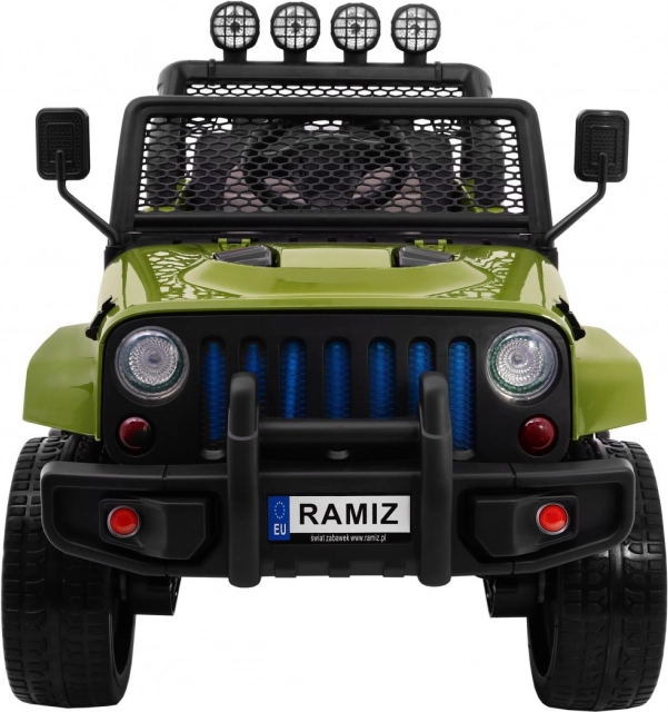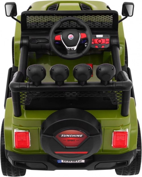 Rodiče ocení dálkové ovládání 2,4 GHz se třemi rychlostmi a bezpečnostním tlačítkem Stop. Interiér nabízí sedadlo z ekokůže s pásy a bohatou světelnou výbavu: přední LED, horní světla na rámu a podsvícenou masku s vypínačem. Nechybí otevírací dveře, skládací transportní madlo a praktický schovávek ve „spare“ kole.