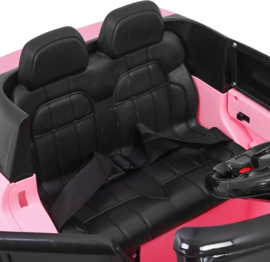 Rodiče ocení dálkový ovladač 2,4 GHz se třemi rychlostmi a tlačítkem bezpečnostního zastavení STOP. O pohodlí se starají čtyři tlumiče (2× vpředu, 2× vzadu), bezpečnostní pásy a otevírací dveře s blokací. Audio panel nabídne přehrávání z USB, SD karty, přes AUX i vestavěné melodie, nechybí klakson na volantu a ukazatel stavu nabití.