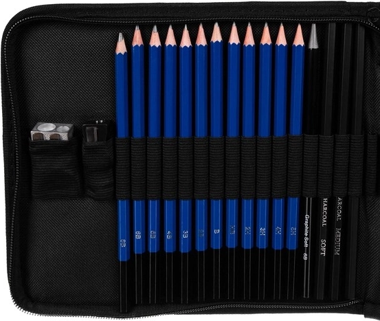 Komplexní kreslířská sada pro skicování a stínování v praktickém zipovém pouzdře. Najdete v ní tužky různých tvrdostí, uhlíky, grafitové tyčinky, blendry, gumy a ořezávátka – vše, co potřebujete pro precizní kresbu i volnou skicu. Ideální pro začátečníky i pokročilé, s důrazem na bohatou výbavu, organizované uložení a mobilitu.