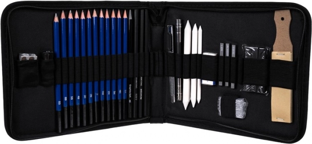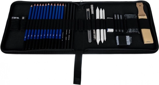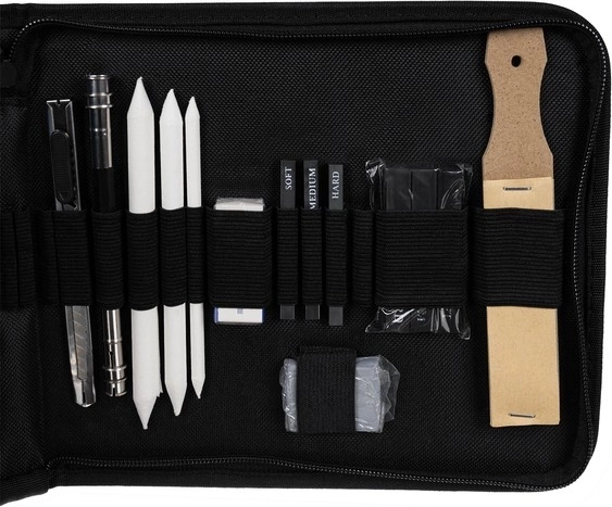 Součástí jsou také blendry (papírové tortillony) ve třech průměrech, knihařský nůž, dvojité i klasické ořezávátko, kneadovaná (tvárná) guma i klasická guma a sada brusných papírů pro dokonalé tvarování hrotu. Sada je skvělá pro portrét, technickou kresbu i umělecké skici.