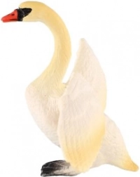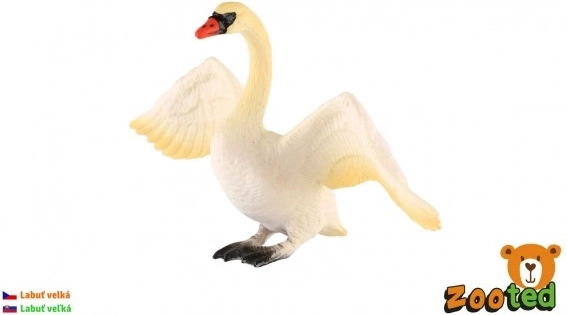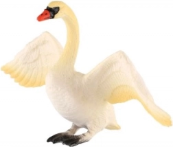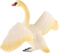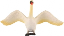 Figurína zachycuje labuť ve vzpřímeném postoji s mírně roztaženými křídly, připomínající její přirozené chování.