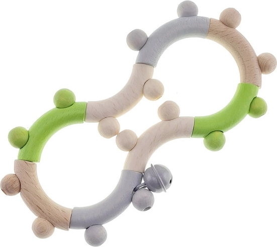 Objevte jemné dřevěné chrastítko ve tvaru barevné osmičky, které podporuje rozvoj jemné motoriky a smyslového vnímání již od narození. Díky elastické šňůrce lze jednotlivé díly snadno posouvat a vytvářet různé tvary, což z chrastítka dělá skvělého společníka doma i na cestách.