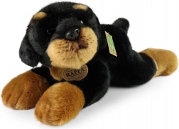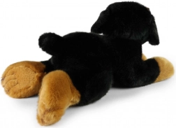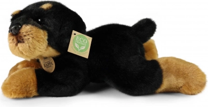Roztomilý plyšový pes Rottweiler v ležící poloze o délce 30 cm potěší děti i dospělé. Má realistické zpracování, vysoce kvalitní měkký plyš a eco-friendly výplň z recyklovaných PET lahví, která je bezpečná i pro nejmenší.