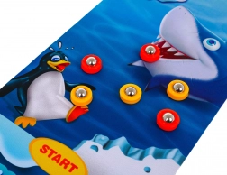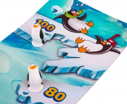 Velká, jasně značená podložka se startem a číselnými poli pro snadné počítání bodů. Motiv oceánu s tučňáky a žralokem podtrhuje atmosféru hry.