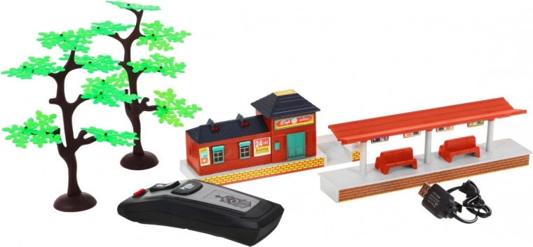 - Nádraží cca 17 × 8 cm, stanice cca 20 × 6 cm, 2× stromek cca 16 × 10 cm
