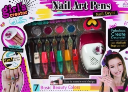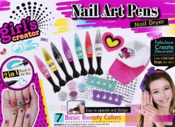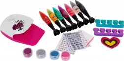 Obsahuje sušičku na nehty napájenou bateriemi, dekorativní kamínky, množství nálepek a další pomůcky pro nehtové umění.