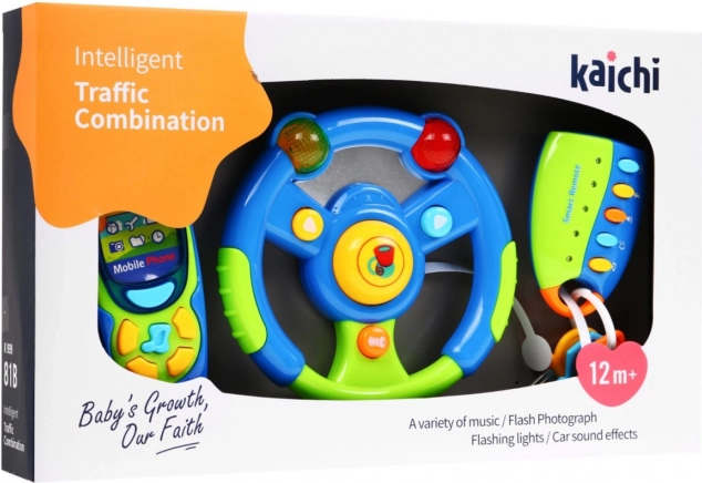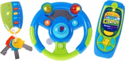 Interaktivní sada pro malé děti obsahuje mobilní telefon s různými tlačítky, která přinášejí radostné zvuky a melodie. Volant je vybaven interaktivním displejem, který se aktivuje po stisknutí tlačítek, včetně zvuků jako je klakson, startování auta a blinkry. Klíče s dálkovým ovladačem nabízejí pět funkcí pro ještě více zábavy.