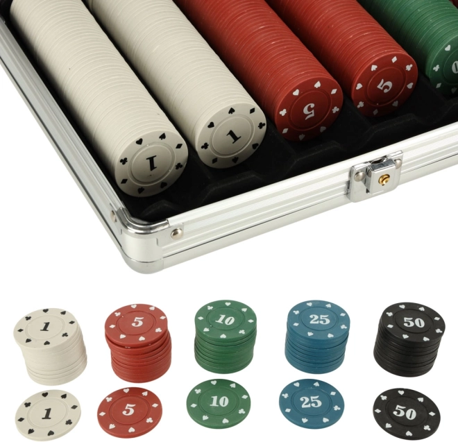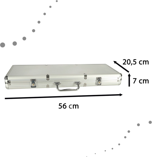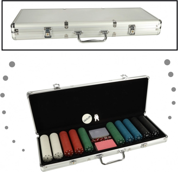 Sada obsahuje žetony, karty a kostky pro různé varianty her. Stříbrný kufřík zajišťuje bezpečné uchování komponent i snadný přenos.