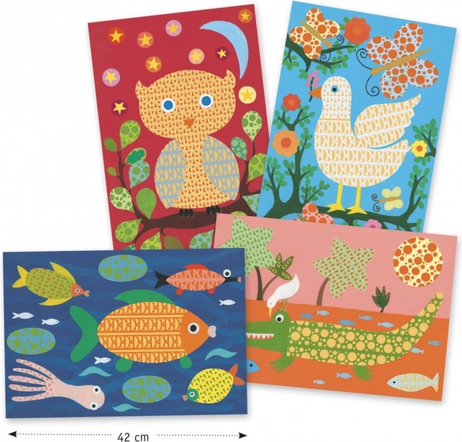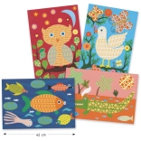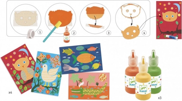 - Vše v balení – pozadí, části zvířátek, barvy, šablony, lepící puntíky a houbička.
