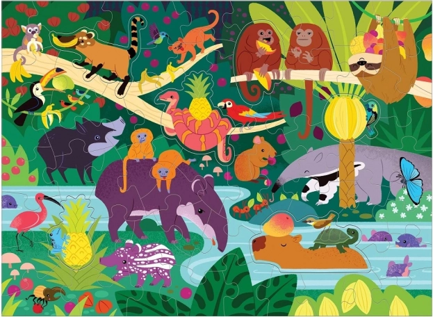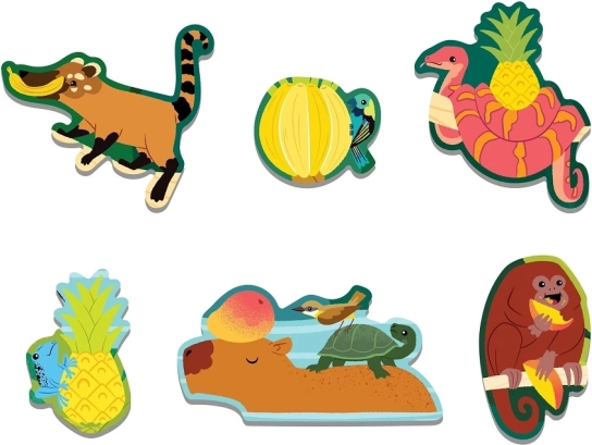 Živá džungle se zvířaty a tropickým ovocem rozvíjí pozornost a představivost. Ideální pro společné skládání a učení hrou.