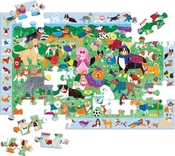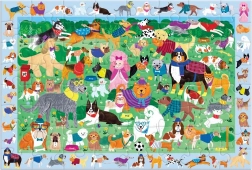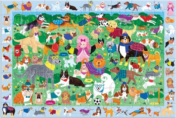 Puzzle Mudpuppy Skládej a hledej: Psí den přináší chytrou kombinaci skládání a hledací hry, která rozvíjí pozorovací schopnosti, trpělivost a jemnou motoriku. Po složení scény plné pejsků mohou děti hledat více než 40 skrytých postaviček v rámečku kolem obrázku – ideální zábava pro děti od 4 let.
