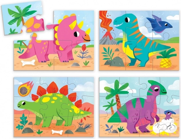 Sada Mudpuppy Dinosauři 4 v 1 přináší čtyři různé skládanky s veselými ilustracemi dinosaurů od Kathryn Selbert. Každé puzzle má jinou úroveň obtížnosti (4, 6, 9 a 12 dílků), takže je ideální pro postupný rozvoj jemné motoriky, trpělivosti a logického myšlení dětí od 2 let.