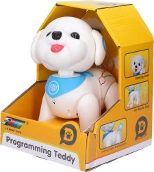 Pes RC na dálkové ovládání. Rozměry 15x10x20 cm. 3xAA baterie do psa, a 1xCR2025 do ovladače nejsou součástí. Funkce: chůze dopředu, zastavení, ovládání hlasitosti, kývání hlavou, štěkání, programování, ovládání tleskáním, hudba (tanec).