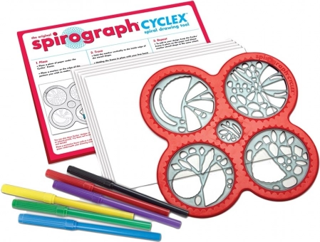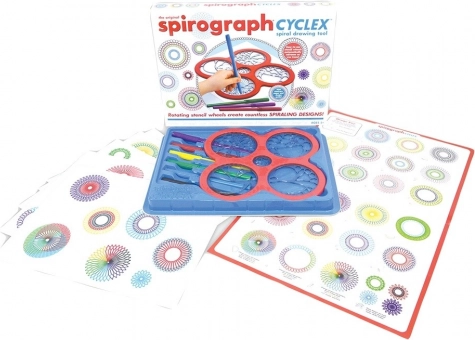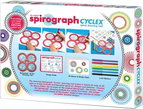 V balení najdete šablonu CYCLEX, rotující kolečka, papíry a barevné fixy – vše připraveno k tvorbě detailních spirál a mandal hned po otevření.