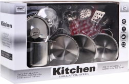 Balíček obsahuje vše, co je potřeba pro malé kuchařské experimenty: velký a malý hrnec s pokličkou, pánev, cedník, i praktické kuchyňské náčiní (naběračka, obracečka, pěnovačka, servírovací vidlice na těstoviny) a podložku. Ideální dárek pro děti od 3 let.