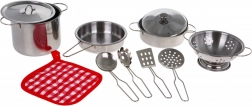 Velký a malý hrnec s pokličkou, pánev, cedník a čtyři kovové nástroje plus podložka – vše, co dítě potřebuje k vaření a servírování.