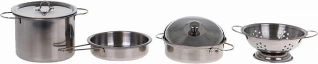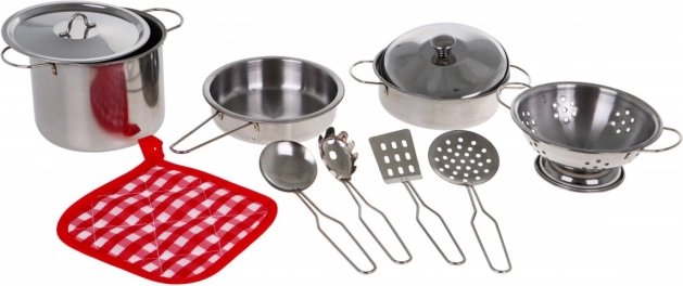 Lesklé hrnce, pánev a cedník vypadají jako skutečné kuchyňské vybavení, ale v dětské velikosti. Skvělé pro hru na kuchaře a kuchařku.