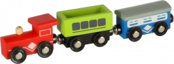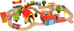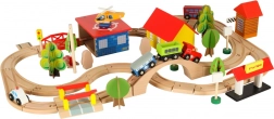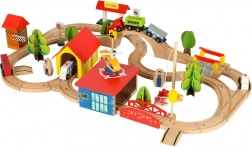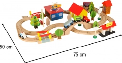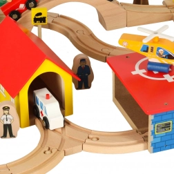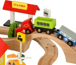 Objevte neomezené možnosti s touto barevnou dřevěnou vlakovou soupravou. Sada obsahuje nádraží, mosty, přistávací plochu pro helikoptéru, figurky a další prvky, které umožňují vytvořit své vlastní městečko.